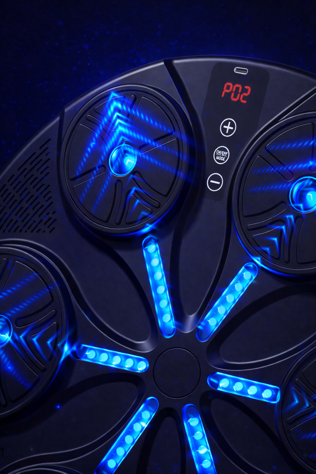 The round target panel features multiple strike pads equipped with built-in LED lights that respond when hit, creating an engaging training experience. A digital display screen shows operating information and active modes, helping you stay focused during sessions.