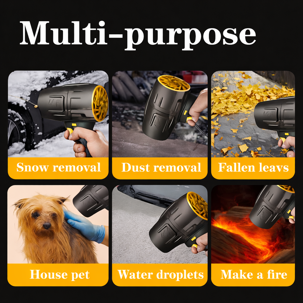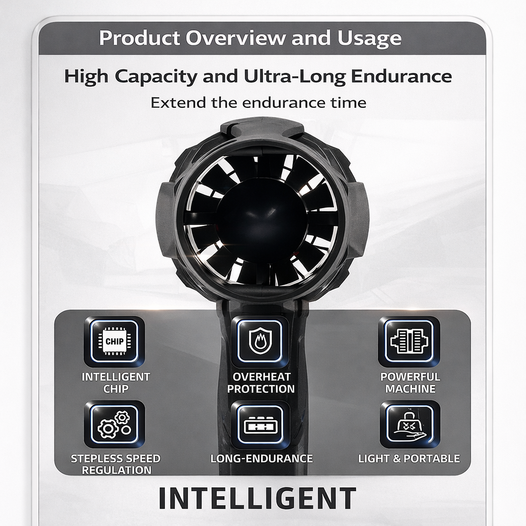 The product includes the electric blower unit, a rechargeable battery, a charging adapter, and a storage case as shown in the images. It is intended for dry-use environments only and should not be exposed to water, high humidity, or flammable materials, as outlined in the included safety guidelines. This electric blower is designed for controlled air blowing applications and general maintenance use.