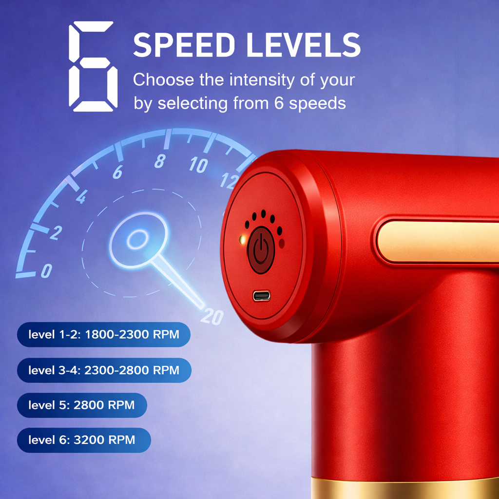 مسدس تدليك مع شدة قابلة للتعديل و4 رؤوس تدليك قابلة للتبديل وقابل لإعادة الشحن عبر USB