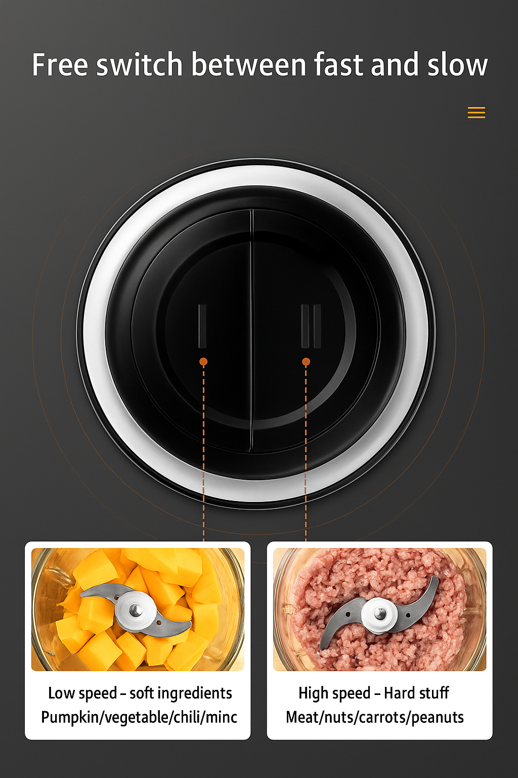 Prepare ingredients quickly with the 2L Electric Food Chopper Stainless Steel Double Blade Kitchen Grinder. Designed for powerful chopping and mixing, it handles vegetables, meat, nuts, onions, garlic, and sauces with smooth efficiency. Its large 2 liter bowl makes it ideal for family kitchens in Saudi Arabia, offering faster meal preparation for everyday cooking.